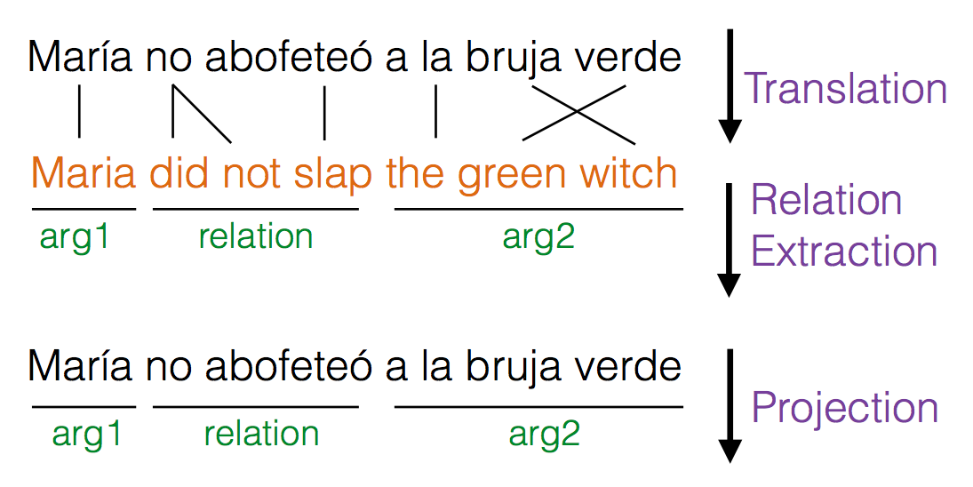 | Relation extraction in a Spanish sentence using the cross-lingual relation extraction pipeline. |