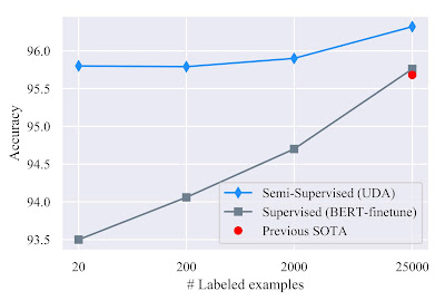 Benchmark on IMDb, a sentiment analysis task. UDA surpasses state-of-the-art results in supervised learning across different training sizes. |