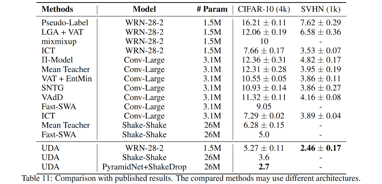 SSL benchmark on CIFAR-10 and SVHN image classification tasks. UDA surpases existing semi-supervised learning methods. |