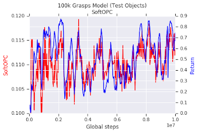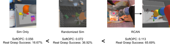 SoftOPC score and true performance for 3 different sim-to-real methods: a baseline simulation, a simulation with random textures and lighting, and a model trained with RCAN. All three models are trained with no real data, then evaluated with off-policy evaluation on a validation set of real data. The ordering of the SoftOPC score matches the order of real grasp success. |
