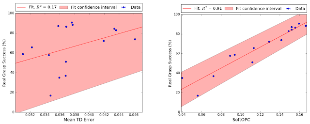 Results from our sim-to-real evaluation experiment. On the left is a baseline, the temporal difference error of the model. On the right is one of our proposed methods, the SoftOPC. The shaded region is a 95% confidence interval. The correlation is significantly better with SoftOPC. |
