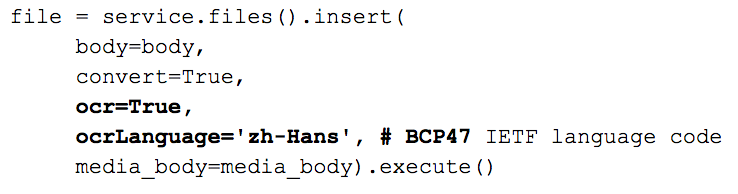 You don’t even need to specify which language the document is in; the system will determine that automatically. Or, you can use the Google Drive API for more explicit control over the language detection in documents. For example, here is an invocation of the Drive API in Python: